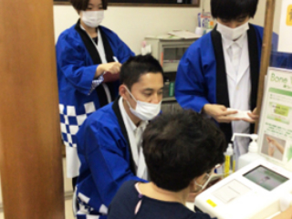骨健康度測定の様子終了後は骨粗しょう症のパンフレットをお渡ししました。薬科大の実習生も参加し、使用方法を患者さんに教える一幕も。